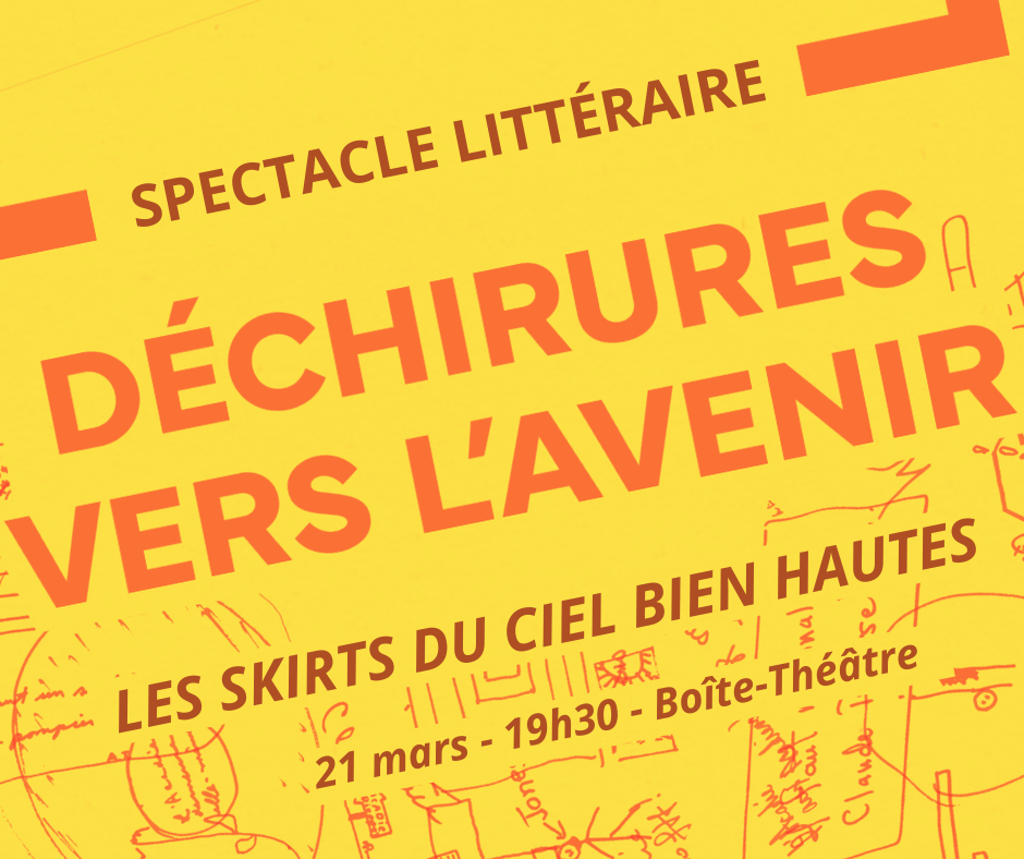 Samedi 21 mars : Spectacle-collage Déchirures vers l’avenir : Les skirts du ciel bien hautes, avec Marc Chamberlain, Paul Bossé, Rose Després, Georgette LeBlanc, Sarah Marylou Brideau, Christian Roy, Jonathan Roy et Denis Surette. Première partie : Joannie Thomas, Poète officielle de la Ville de Caraquet. (Boîte-Théâtre, 19h30)